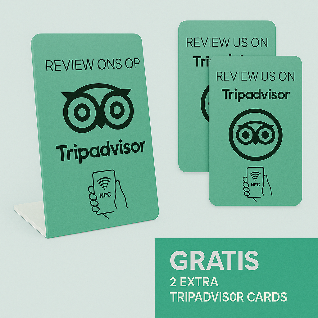 Onze Belofte: Wij zorgen voor alles - van het creëren tot het koppelen van de NFC en QR-code voor directe beoordelingen op je Tripadvisor-profiel. Investeer nu in je reputatie en zie hoe je bedrijf floreert met positieve feedback van je klanten.